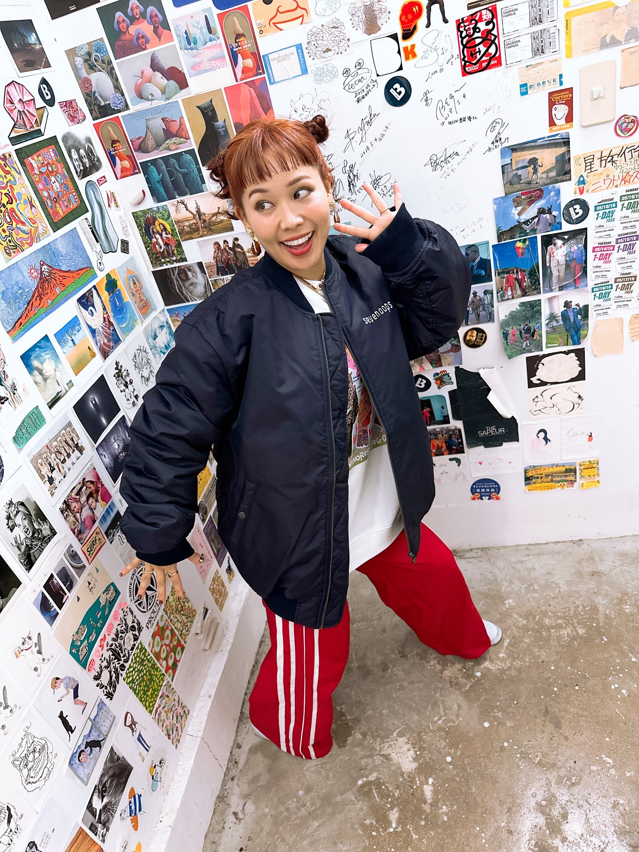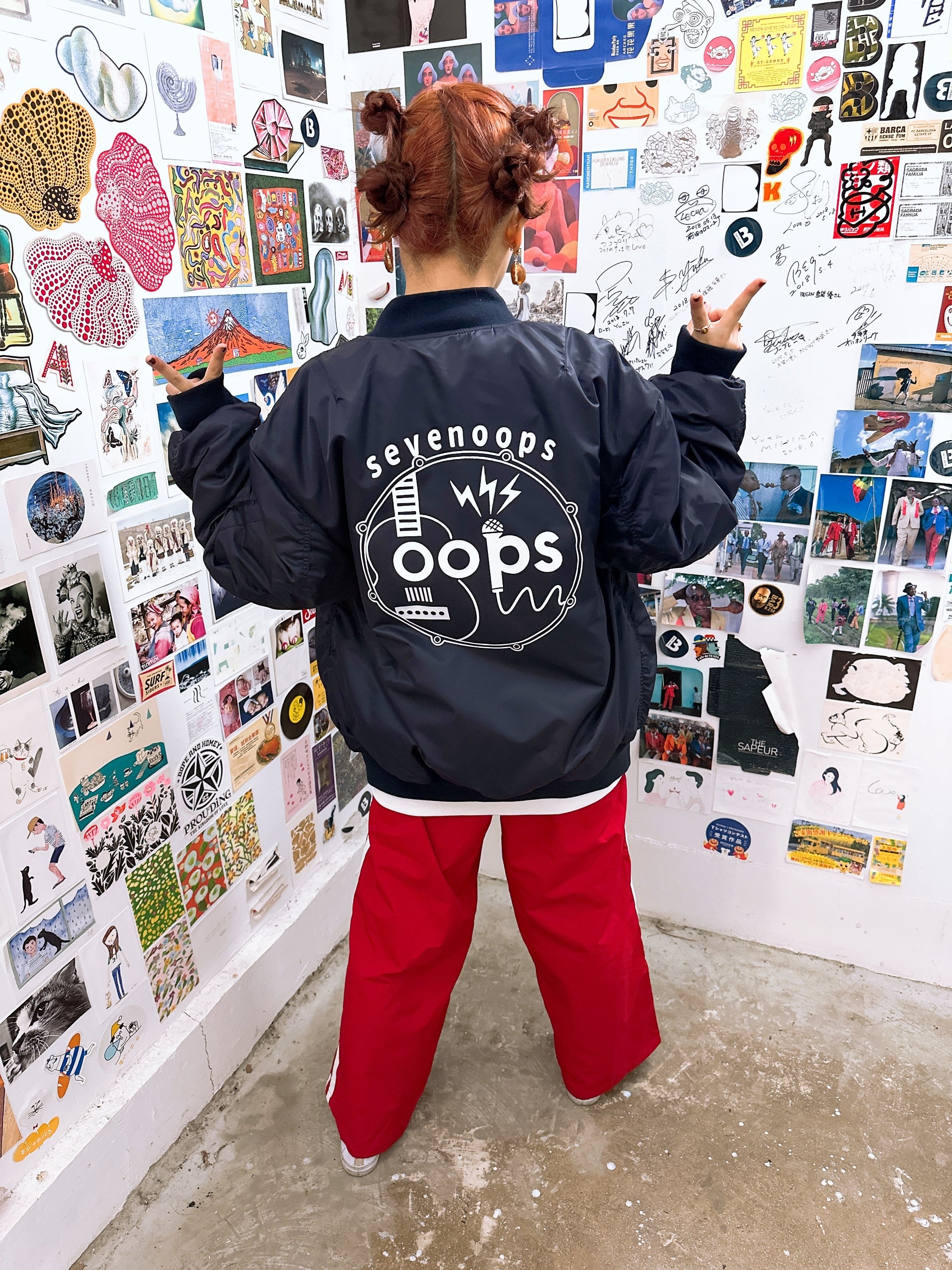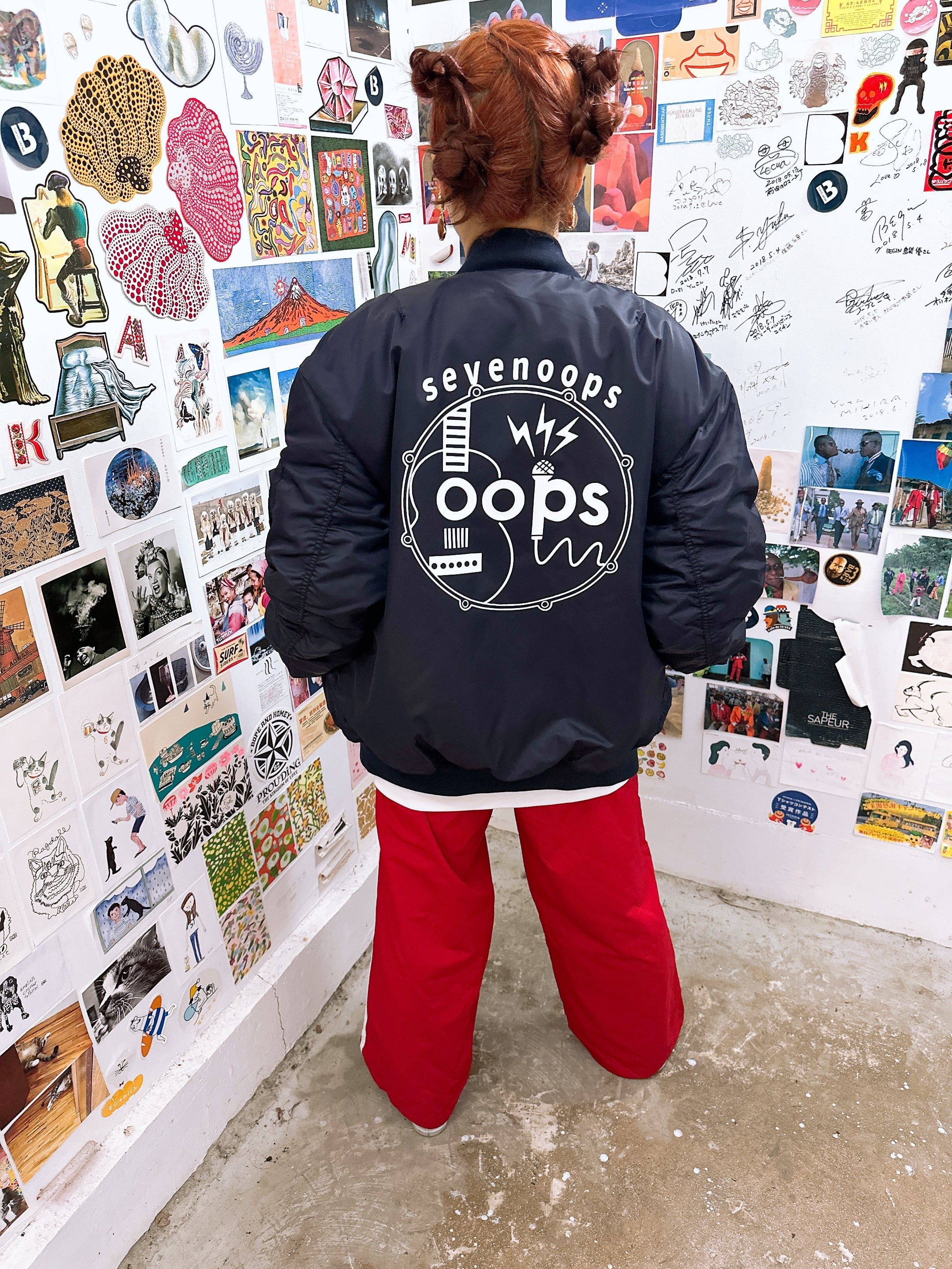 ギターとスネアとマイクでデザインされたoopsロゴを大きくプリントしたMA-1